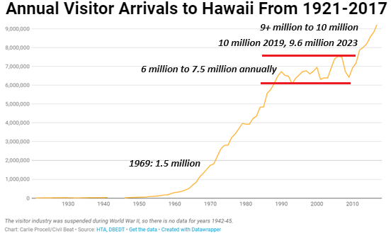 In the initial influx of new revenue, the local populace favors tourism as a source of additional jobs and economic growth. I recall a sense of pride when Hawaii's annual visitor count exceeded 1.5 million in 1969.